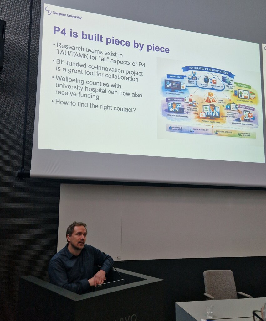 P4-lääketiede on vahvassa nousussa sekä Suomessa että kansainvälisesti. Se tarjoaa uudenlaisen, ennakoivan ja yksilöllisen tavan vastata ihmisten terveyden ja hyvinvoinnin tarpeisiin. Samalla se mahdollistaa terveydenhuollon vaikuttavuuden parantamisen, tehokkuuden kasvattamisen ja kustannuspaineen hillitsemisen. Aiheeseen liittyen Tampereen yliopiston Lääketieteen ja terveysteknologian tiedekunta ja Business Tampere järjestivät P4 lääketieteen tapahtuman 12.2.2026. Teksti: Timo Hänninen, Ilona Raitakari/Business TampereKuvat: Mikko Pesonen, Ilona Raitakari/Business Tampere Day for P4 Medicine -tapahtuma kokosi noin 100 osallistujaa Tampereen yliopiston Kaupin kampuksen Arvo-auditorioon. Paikalla oli tutkijoita, yritysten edustajia sekä eri alojen kliinikoita, joita yhdisti kiinnostus P4-lääketieteeseen. P4-lääketiede (predictive – ennustava, preventive – ennaltaehkäisevä, personalized – yksilöllistetty, participatory – osallistava) on maailmanlaajuinen kehityssuunta, ja Tampere pyrkii olemaan tällä alueella kehityksen eturintamassa. Päivä alkoi yhteiskehittämisosiolla ja tietoiskulla rahoitusmahdollisuuksista, erityisesti Business Finlandista ja EU-ohjelmista. Professorit Juhana Frösen, Kalle Kurppa ja Antti Vehkaoja kertoivat P4-lääketieteen sisällöstä sekä siitä, miten eri tutkimusyksiköt ovat mukana sen toteuttamisessa. Frösen nosti esiin Tampereen yliopiston tutkimuksen kärjet P4-näkökulmasta sekä mahdollisuudet synnyttää uusia menestystarinoita tutkimuslähtöisten yritysten kautta. Kurppa esitteli Prima P4 -hanketta, jossa rakennetaan P4-lääketieteen keskus sekä pilotoidaan toimintamalleja tyypin 1 ja 2 diabeteksen riskien tunnistamiseen ja ennaltaehkäisyyn.Vehkaoja havainnollisti, kuinka P4-lääketiede yhdistää laajasti eri toimialoja – lääketeollisuudesta ja diagnostiikasta tekoälyyn, data-alustoihin, digitaalisiin palveluihin ja digitaalisiin kaksosiin, jotka mahdollistavat ennakoivan ja yksilöllisen hoidon uuden tasonKeskustelussa korostui Business Tampereen terveysteknologiatiimin rooli yhteistyön mahdollistajana, ja Ilona Raitakari esitteli kevään P4-konsortiohankkeiden osallistumismahdollisuuksia, joissa yhdistyvät tutkimus, kehitys ja käyttöönotto käytännön hoitoympäristössä.Aamupäivä päättyi Abomics Oy:n esitykseen, jossa farmakogenomiikka kuvattiin konkreettisena ja nopeasti hyödynnettävänä ratkaisuna yksilöllisen lääkityksen edistämisessä. Tampereella laadukasta tutkimusta Iltapäivän P4-tutkimusseminaarin avasi Tampereen yliopiston MET-tiedekunnan dekaani Seppo Parkkila. Hän korosti puheenvuorossaan, että tekoäly tulee muuttamaan myös lääkärin työtä ja että nykyiset opiskelijat valmistuvat hyvin erilaiseen maailmaan kuin aiemmat sukupolvet. Tampereen yliopiston ja TAMKin P4-työelämäprofessori Arja Halkoaho korosti puheessaan koulutuksen uudistamistarvetta alan nopean kehityksen vuoksi. Pirhan tutkimus- ja kehitysjohtaja Kati Kristiansson kuvasi, miten P4-lääketiedettä voidaan edistää hyvinvointialueen näkökulmasta.Tiedeosion juonsi yliopistotutkija Juulia Jylhävä Tampereen yliopistosta. Tapahtumapäivän kokonaistuotannosta ja tiedeosion ohjelmasuunnittelusta vastasi Tampereen yliopiston P4-lääketieteen kehittäjä Kaisa Aho. Seminaari osoitti Tampereella tehtävän korkeatasoista P4-tutkimusta, erityisesti autoimmuunisairauksien ja liikalihavuuden ehkäisyssä ja hoidossa, sekä yksilön roolia ja kustannusvaikutuksia tarkastelevissa malleissa. Yhteistyöllä saavutetaan parhaat tulokset Päivän päätteeksi käydyssä keskustelussa pohdittiin yliopiston, hyvinvointialueen ja yritysten yhteistyömahdollisuuksia P4-lääketieteen edistämiseksi. Keskustelussa korostui tarve siirtää terveydenhuollon painopistettä ennaltaehkäisyyn. Tavoitteena on vähentää erikoissairaanhoidon kuormitusta ehkäisemällä sellaisia sairauksia ja hoitotarpeita, joihin voidaan vaikuttaa ennakoivalla terveydenhuollolla. Juuri tähän P4-lääketiede pitkälti pyrkii. Yhteistyötä halutaan vahvistaa sekä Suomessa että kansainvälisesti. P4 on tärkeä osa Tampere Healthin toimintaa P4-lääketiede on tärkeässä roolissa Business Tampereen Digital Health 3-hankkeessa, joka jatkuu vuoden 2027 loppuun saakka. Olemme nähneet, että tähän maailma on menossa. Maailmanlaajuisesti pyritään lisäämään sairauksien ennaltaehkäisyä, sekä ihmisten omilla toimilla että julkisen sektorin tehokkaammalla datan käytöllä, toteaa DH3-hankkeen projektipäällikkö Ilona Raitakari. ”Seulontoja lisätään, jotta sairauksiin voidaan puuttua varhaisemmassa vaiheessa, kun niihin voidaan vaikuttaa tehokkaammin”, jatkaa Raitakari. Tampereella on jo nyt vahvaa osaamista P4-lääketieteen kokonaisuuteen liittyen. Lisäksi Tampereen yliopisto on päättänyt panostaa tähän alueeseen merkittävästi lisää tutkimusresursseja. Samalla rakennetaan aktiivisesti yhteyksiä alueen keskeisiin kansainvälisiin toimijoihin ja verkostoihin. P4 avaa yrityksille uusia liiketoimintamahdollisuuksia Julkinen, kansainvälinen panostus P4-lääketieteeseen on näkynyt myös yrityskentässä. Viime vuosina on syntynyt paljon uusia palveluja ja innovaatioita. Data ja tekoäly ovat nousseet erittäin tärkeään rooliin. Myös kuluttajille on jo tarjolla ja tulossa uusia palveluja esimerkiksi pitkäaikaissairauksien omahoidon tueksi. Kokonaisuutta täydentävät erilaiset wellness- ja hyvinvointipalvelut, kuten älykellot ja -sormukset, joiden keräämää tietoa voidaan hyödyntää myös terveydenhuollossa. Tavoitteena on entistä yksilöllisempi sairauksien hoito ja terveyden ylläpito. Suomessa on tällä alalla erinomaista osaamista, ja liiketoiminnallinen potentiaali on merkittävä. Ilona Raitakari Asiakkuusvastaava, Tampere Health 040 124 4956 ilona.raitakari@businesstampere.com 040 124 4956 Timo Hänninen Terveysalan vastaava 0505181830 timo.hanninen@businesstampere.com 0505181830 P4 lä