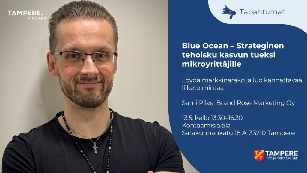 Löydä markkinarako ja luo kannattavaa liiketoimintaa – koulutus mikroyrittäjille. Mitä saat? Tämä koulutus antaa sinulle työkaluja tarkastella oman liiketoimintasi jokaista osa-aluetta asiakkaan näkökulmasta, jotta voit erottua markkinoilla. Mitä tämä tehoisku tarjoaa? Innovaatiota: Näet yrityksesi prosessit mahdollisuuksina, jota muut eivät näe. Inspiraatiota: Opit tunnistamaan markkinaraot, joissa kilpailijasi eivät edes osaa olla läsnä. Ratkaisuja: Konkreettinen malli arvon kasvattamiseen ilman, että joudut laskemaan hintaa. Tämä koulutus sopii sinulle, joka haluat: lisää varmuutta ja suuntaa siihen, mihin olet yritystäsi viemässä ymmärtää paremmin, mikä sinun yrityksessäsi oikeasti tuottaa arvoa asiakkaalle keskittyä siihen, missä olet oikeasti hyvä, kilpailematta hinnalla oppia katsomaan yritystäsi tavalla, joka auttaa erottautumaan Koulutus perustuu Blue Ocean Strategy ‑ajatteluun, mutta käytännönläheisesti ja ymmärrettävästi esitettynä. Vetäjänä toimii strategisen markkinoinnin ja liiketoiminnan asiantuntija sekä yrittäjä Sami Pilve, joka hyödyntää tätä kaikkea tietoa päivittäin sekä omassa liiketoiminnassaan että asiakastyössään. Aikataulu:13.30–14.00 Kahvittelu & pientä naposteltavaa14.00–16.00 Puhuja16.00–16.30 Verkostoituminen, kysymykset sekä vapaamuotoinen keskustelu. Ilmoittautuminen tapahtumaan päättyy 11.5.2026 kello 9.00. Tervetuloa! Register Copy the event page link