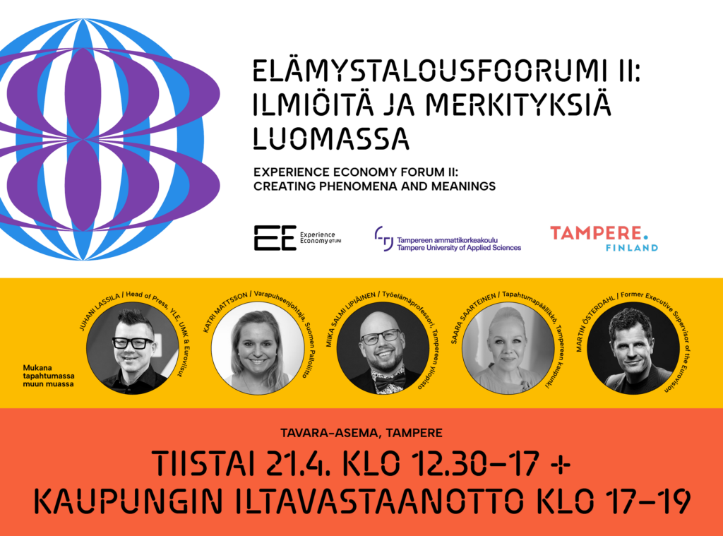 Tervetuloa Elämystalousfoorumi II -tapahtumaan! Tämän vuoden foorumissa pureudumme polttavaan kysymykseen:Miten luodaan ilmiöitä ja merkityksiä, kun kilpailu ihmisten huomiosta ja ajasta kiristyy? Elämystalousfoorumi II hakee ajankohtaisella ja inspiroivalla puhujakaartillaan vastauksia mm. siihen: Miten hallita ilmiöiden sattumanvaraisuutta ja vaalia erottuvuutta tuotannoissa ja näkyvyystyössä? Mikä on olennaista ilmiöittämisessä ja merkitysten luomisessa? Kuka tulevaisuudessa määrittää mistä tulee ilmiö – algoritmit, yhteisöt vai rohkeat toimijat? Päivätilaisuuden klo 12.30-17 jälkeen Tampereen kaupunki kutsuu klo 17-19 osallistujat iltavastaanotolle, joka tarjoaa tilan ajankohtaisille keskusteluille, verkostoitumiselle – ja tietenkin elämyksille! Tapahtuma on maksuton ja esteetön. Tapahtuman kieli on suomi, mutta osa puheenvuoroista pidetään englanniksi. Tilaisuuden tarkempi ohjelma julkaistaan täällä! Register Copy the event page link