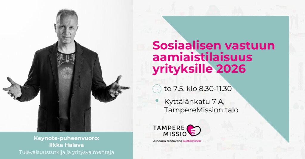 TampereMission keväiset aamiaistilaisuudet ovat ystäväyrityksillemme ja uusille kiinnostuneille yhteistyökumppaneille suunnattuja verkostoitumistilaisuuksia, joissa kuullaan ajankohtaisia puheenvuoroja yritysten sosiaalisen vastuun teemoista.