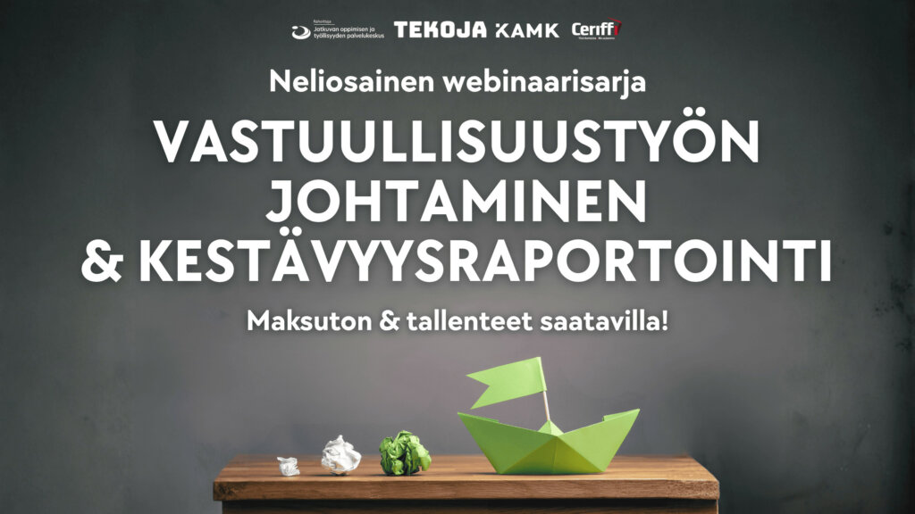 Lähde mukaan webinaarisarjaan, josta saat käytännön vinkkejä yrityksesi vastuullisuustyöhön ja opit, miten vastuullisuusohjelma toteutetaan käytännössä. Saat ajankohtaista tietoa, konkreettisia esimerkkejä, apua ja inspiroivia näkökulmia alan asiantuntijoilta. Luennoitsijana toimivat alan huippuasiantuntijat Ceriffi Oy:stä.