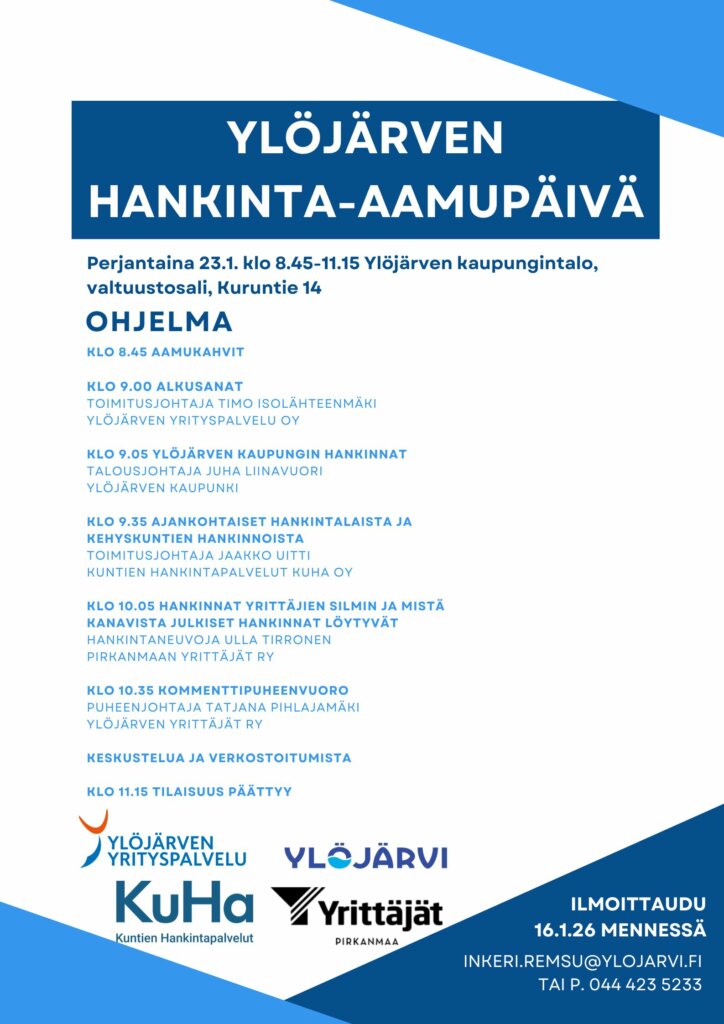 Tervetuloa Ylöjärven hankinta-aamupäivään 23.1.26 Ylöjärven kaupungintalolle! Saat tietoa tulevista hankinnoista, hankintojen perusteista ja siitä, miten kilpailutuksiin pääsee mukaan. Ohjelma8.45 Aamukahvit9.00 Alkusanat | Toimitusjohtaja Timo Isolähteenmäki, Ylöjärven Yrityspalvelu Oy9.05 Ylöjärven kaupungin hankinnat | Talousjohtaja Juha Liinavuori, Ylöjärven kaupunki9.35 Ajankohtaiset hankintalaista ja kehyskuntien hankinnoista | Toimitusjohtaja Jaakko Uitti, Kuntien hankintapalvelut Kuha Oy10.05 Hankinnat yrittäjien silmin ja mistä kanavista julkiset hankinnat löytyvät | Hankintaneuvoja Ulla Tirronen, Pirkanmaan Yrittäjät ry10.35 Kommenttipuheenvuoro | Puheenjohtaja Tatjana Pihjalamäki, Ylöjärven Yrittäjät ryKeskustelua ja verkostoitumista11.15 Tilaisuus päättyy Tilaisuus on maksuton ja avoin kaikille. Ilmoittautumiset 16.1. mennessä Inkeri Remsulle inkeri.remsu@ylojarvi.fi tai 044 423 5233 Register Copy the event page link