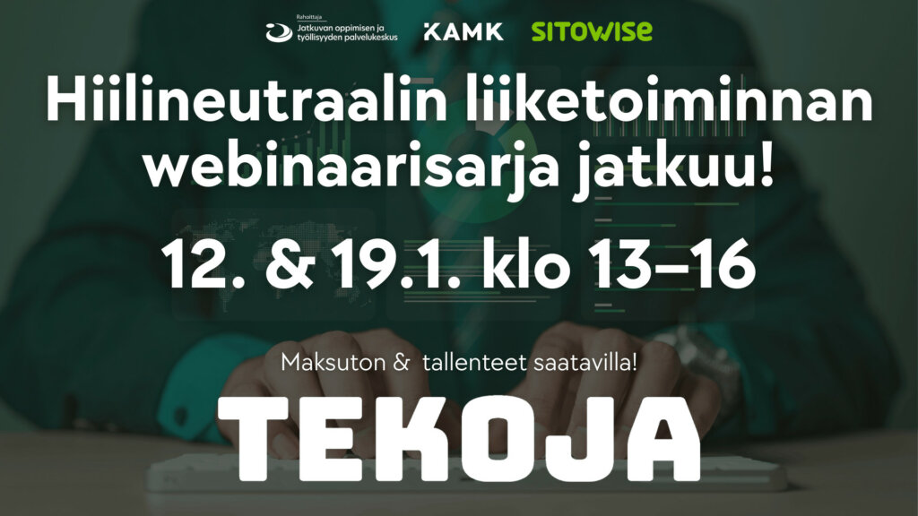 Kestävyys- ja vastuullisuusvaatimusten koskettaessa yhä useampia organisaatioita, myös hiilineutraalius liiketoiminnassa on noussut yhä keskeisempään rooliin. Ennakkoilmoittaudu mukaan tammikuussa starttaaviin maksuttomiin webinaareihin, jossa luennoitsijana Sitowisen huippuasiantuntijat! Webinaarien ajankohdat ja aiheet: 12.1. Klo 13-16 Hiilikompensaatioprojektin suunnittelu ja laskenta 19.1. Klo 13-16 Hiilihyvitysprojektien kaupallistaminen ja vastuullisuusviestintä Jos et pääse webinaariin kyseisenä ajankohtana, voit katsoa webinaarit myös tallenteena Reppu- järjestelmässä kun ehdit. Repusta löytyvät jo kurssin aiemmat webinaarit. Lue lisää ja ilmoittaudu webinaareihin linkin kautta! Ilmoittautuessasi webinaareihin saat myös samalla opinto-oikeuden suorittamaan uudistuvan hiilineutraalin liiketoiminnan opintojaksoa. Ilmoittautuminen on maksutonta, eikä sido suorittamaan opintojaksoa. Voit halutessasi osallistua pelkästään webinaareihin. TEKOJA-hanke (Toimiva, ekologinen vesi ja jätehuolto) tarjoaa koulutusta puhtaasta siirtymästä, kiertotaloudesta, uudistuvasta vesi- ja jätehuollosta sekä vastuullisesta, kestävästä ja hiilineutraalista liiketoiminnasta. Hankkeen rahoituksen on myöntänyt Jatkuvan oppimisen ja työllisyyden palvelukeskus. Siirry tapahtuman sivuille Kopioi tapahtumasivun linkki