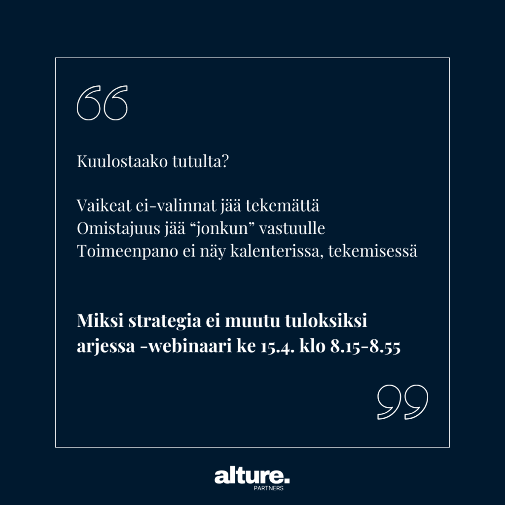Strategia voi olla kunnossa paperilla, mutta silti arki ei muutu. Usein haaste ei ole suunnassa, vaan siinä mitä tapahtuu sen jälkeen – tai jää tapahtumatta. Pidämme 30 min webinaarin, jossa käymme läpi: ✅ miksi strategiat jäävät helposti toteutumatta ✅ mitä ei-valinnat tarkoittavat käytännössä ✅ miten strategia puretaan konkreettisiksi päätöksiksi ja tekemiseksi Saat mukaan selkeän mallin, jota voi hyödyntää heti johtoryhmässä tai hallituksessa. 🎙️ Esiintyjät Partnerit Ilkka Kaikuvuo & Irene Viinikkala Ilmoittaudu Kopioi tapahtumasivun linkki